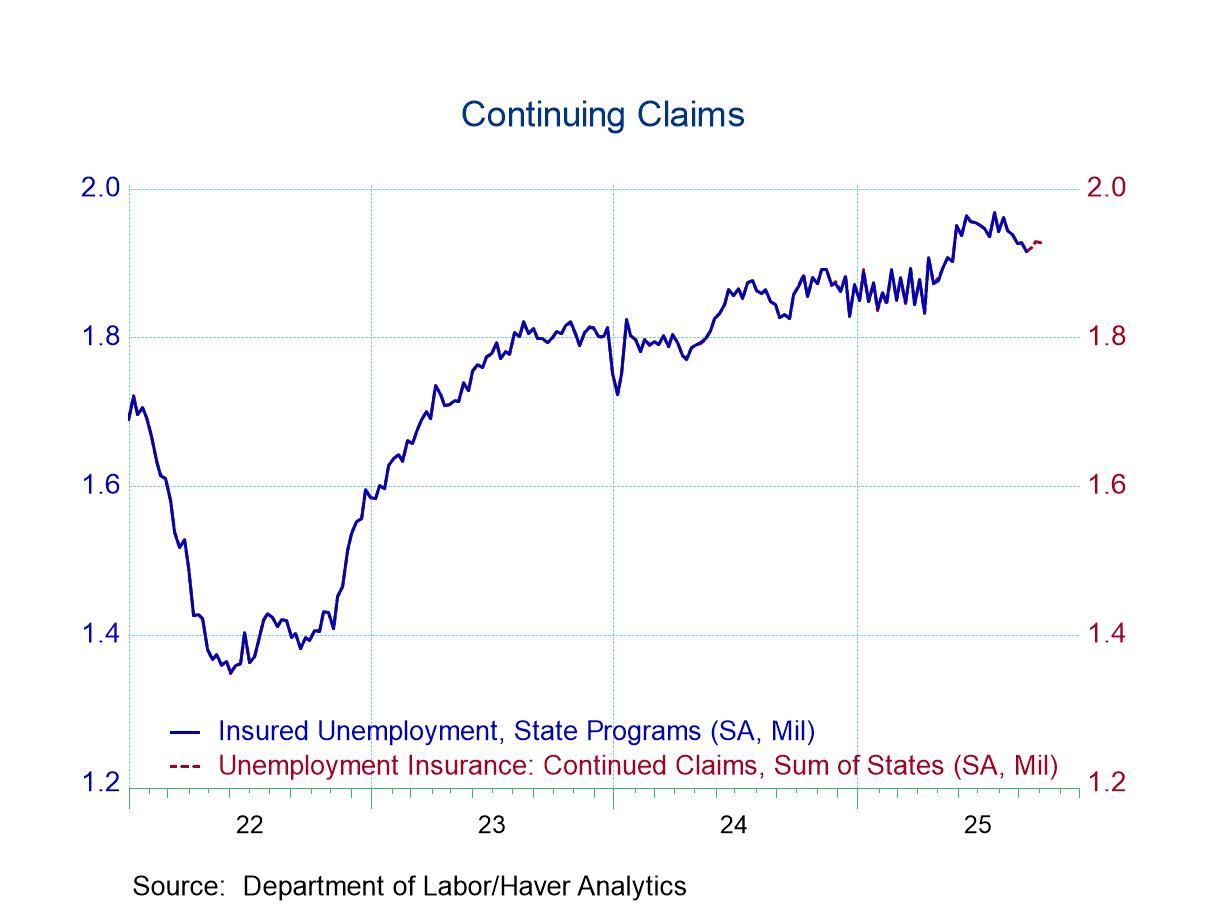 Continuing claims for unemployment insurance, also calculated by Haver Analytics by summing state claims, fell to 1.928 million in the week ended October 4 after rising to 1.929 million in the prior week. Their trend tells the same story as initial claims; that is, labor market conditions are uneven. Still, continuing claims have risen 3.1% y/y, which is less than half the peak rate of 7.7% this past April.