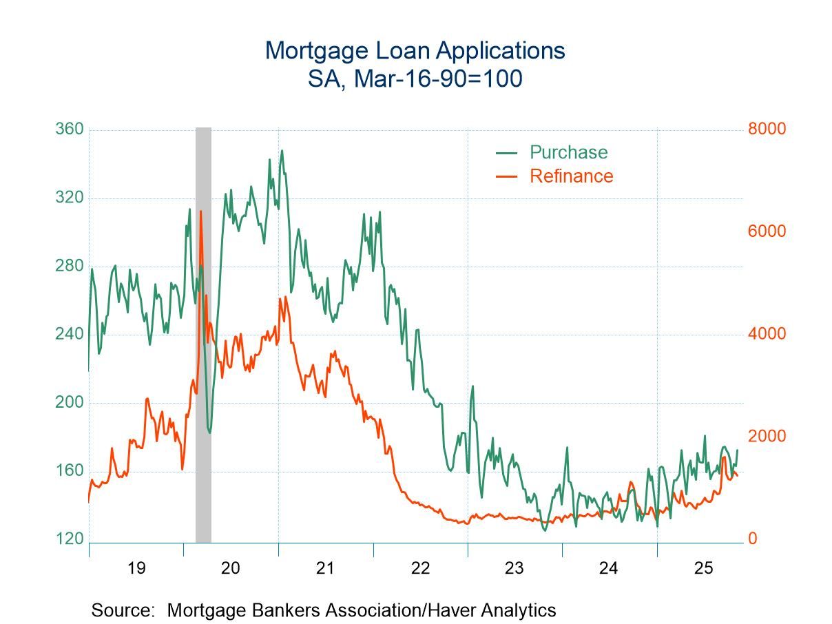 The Mortgage Bankers Association Survey covers 75% of all U.S. retail residential mortgage applications and has been conducted weekly since 1990. Respondents include mortgage bankers, commercial banks and thrifts. The base period and value for all indexes is March 16, 1990=100. The figures for weekly mortgage applications and interest rates are available in Haver’s SURVEYS database.
