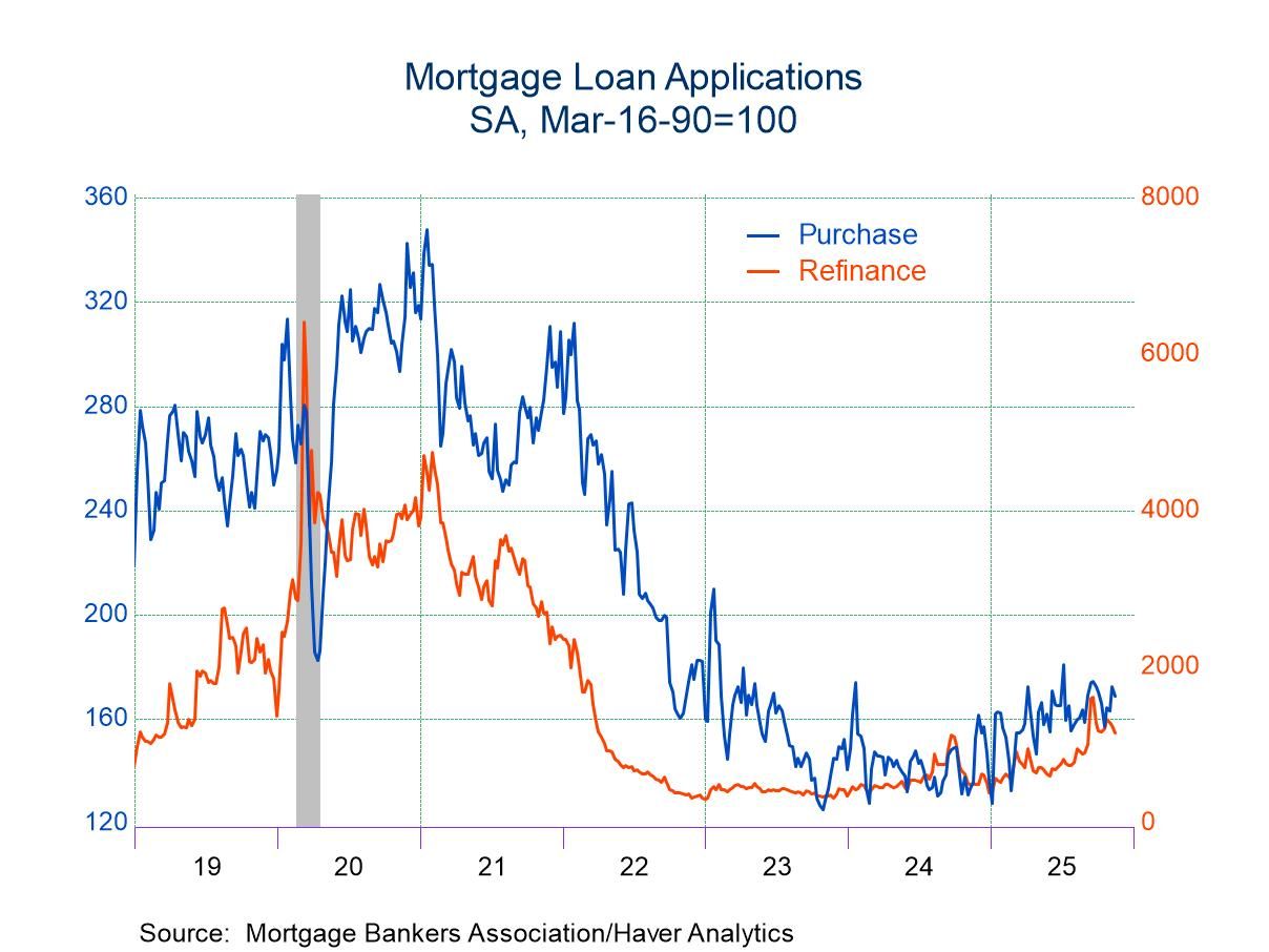 Purchase loan applications declined last week by 2.3% (+24.0% y/y) after rising 5.8% in the prior week, and easing 0.6% one week earlier. Applications to refinance an existing loan declined 7.3% (+124.7% y/y) following a 3.4% decline in the prior week, and falling 2.8% one week earlier.