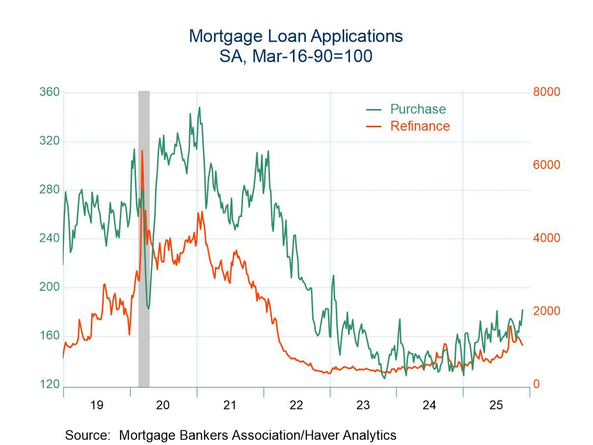 The Mortgage Bankers Association Survey covers 75% of all U.S. retail residential mortgage applications and has been conducted weekly since 1990. Respondents include mortgage bankers, commercial banks and thrifts. The base period and value for all indexes is March 16, 1990=100. The figures for weekly mortgage applications and interest rates are available in Haver’s SURVEYS database.