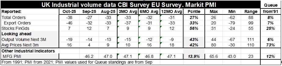 The PMI industrial indicator is up to date through September; here we have a comparison of the manufacturing PMI to the CBI survey. The manufacturing PMI eased to 46.2 from 47 in September. The manufacturing PMI on averages over 12-months, 6-months and 3-months is without a clear trend and has been fluctuating. The manufacturing PMI on data back to 2021 has a 12-percentile standing. The clear message is that conditions in manufacturing in the UK are very weak as the CBI and PMI percentile standings agree. Combined with the CBI inflation outlook, it leaves the BOE in a difficult place.