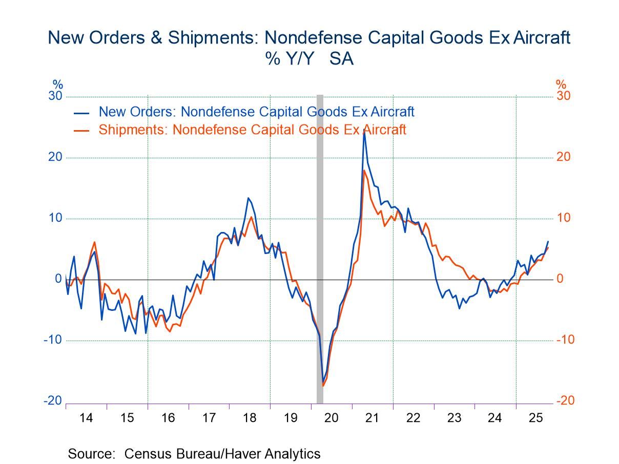 Shipments of core capital goods (nondefense capital goods shipments excluding aircraft) are a reliable coincident indicator of business spending on equipment in the national accounts. They rose 0.7% m/m in October following an upwardly revised 1.2% monthly gain in September (previously +0.9%). The was the second consecutive monthly increase and the fifth in the past six months. The strong end to Q3 and the continued rise in the first month of Q4 provides a solid starting point for all of Q4. The October shipments figure was 5.9% at an annual rate above the Q3 average. Core capital goods orders rose 0.5% m/m in October on top of an upwardly revised 1.1% m/m increase in September (previously +0.9%). This was the fourth consecutive monthly rise.