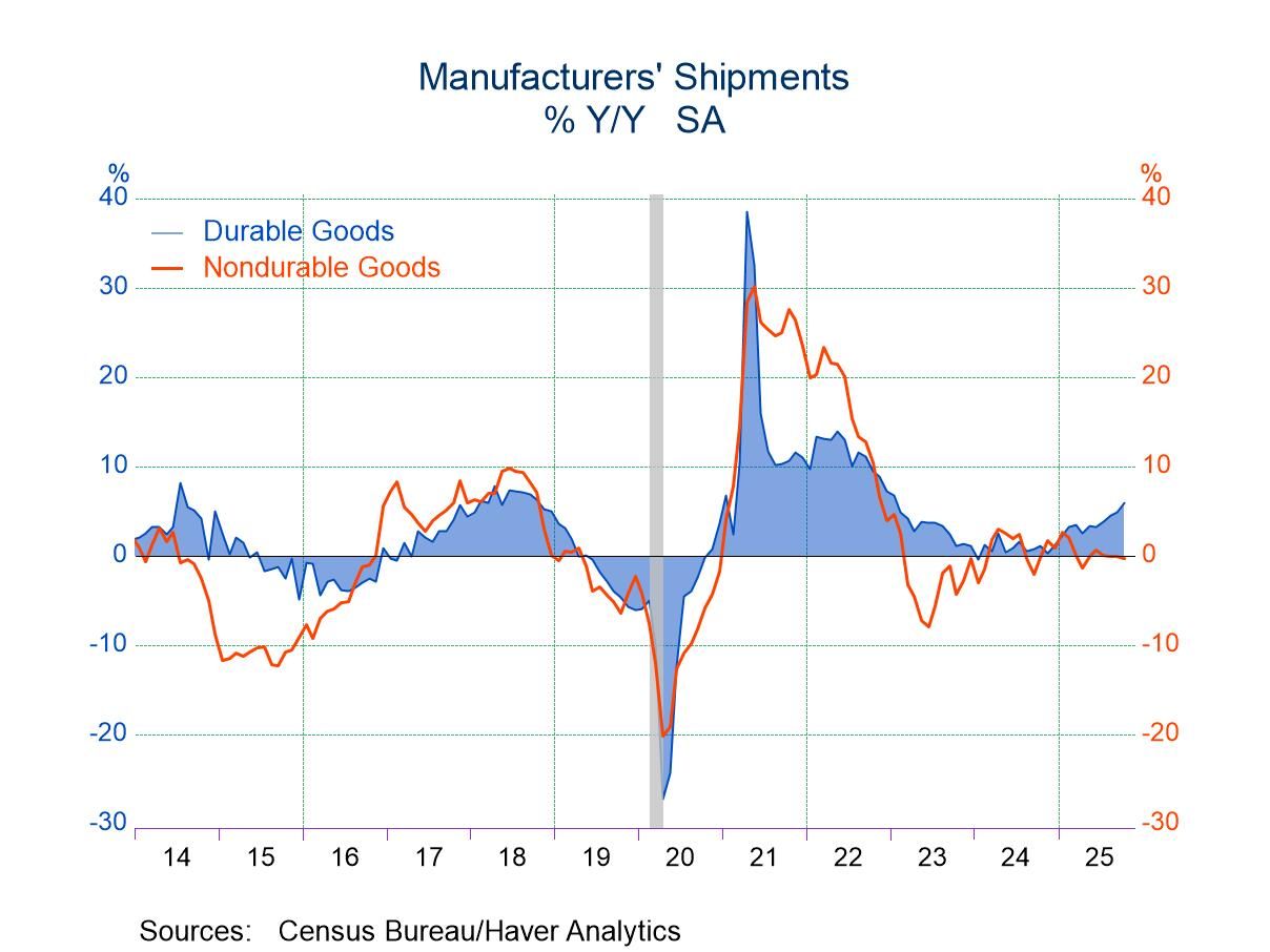 Total manufacturing shipments edged up 0.1% m/m (+2.8% y/y) in October after having been essentially unchanged in September. Shipments of durable goods increased 0.6% m/m (5.9% y/y), led by 1.4% monthly jump in transportation shipments. However, apart from a 0.1% m/m decline in shipments of other durable goods, all of the other major sectors posted monthly gains in October. In contrast, shipments of nondurable goods fell 0.4% m/m (-0.3% y/y) in October for their third consecutive monthly decline. The monthly decline was led by a 2.4% m/m fall in shipments of petroleum and coal products although it was relatively widely spread across major sectors. The one exception was a 2.1% m/m increase in leather product shipments, but this came after four consecutive sizeable monthly declines.