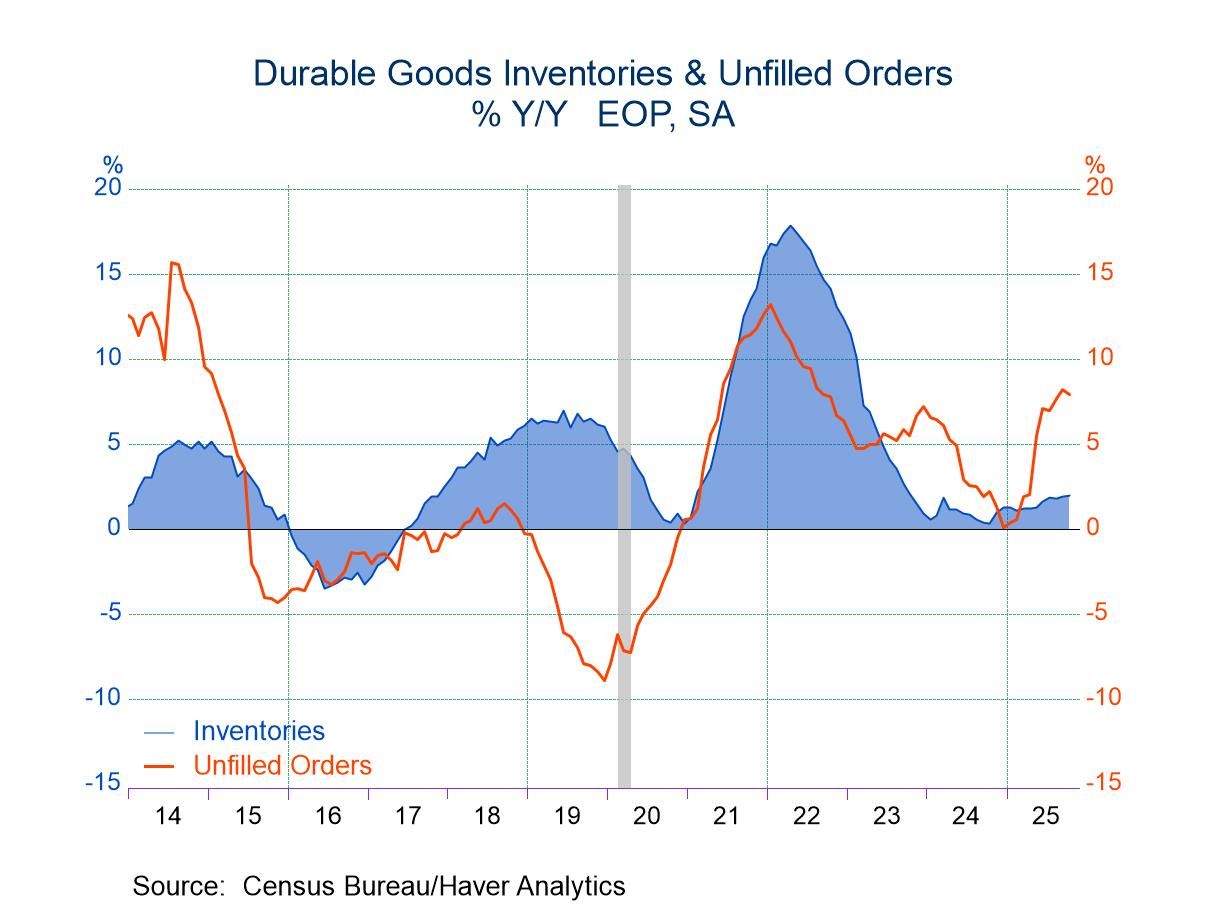 Unfilled durable goods orders increased 0.2% m/m (7.9% y/y) in October for their third consecutive monthly gain following a 0.8% m/m rise in September and a 0.7% m/m increase in August. Total factory inventories were unchanged in October (+1.4% y/y) following 0.1% monthly declines in both August and September. Durable goods inventories edged up 0.1% m/m in October while inventories of nondurable goods fell 0.2% m/m, the third consecutive monthly decline.